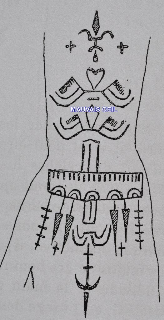 Controversées données aux rares représentations rupestres de l’œil ne permettent guère de considérer celles-ci comme des indices suffisants de la présence de cette croyance à des temps très éloignés. Malgré la tentation de voir dans les gravures rupestres de la « mainmise» ou dans celles des mains seules, l’ancêtre de la « main de Fatma », on ne peut que suivre Le Quellec qui refuse de voir un quelconque rapport entre les deux et par conséquent, un quelconque rapport avec le mauvais œil, et qui prudemment, préfère poser la question suivante: « Ces, mains … ne seraient-elles pas l’expression d’un désir de mainmise magique, d’une volonté de domination, voire d’appropriation ? » (426). Ajoutons à cela que sur l’ensemble du corpus des stèles libyques inscrites de l’Abbé Chabot, seules les nº 63 et 67 comportent la représentation de la main. On constate aussi une quasi-absence du mauvais œil dans la littérature orale des contes. Le corpus kabyle de Mouliéras n’en contient que deux: le conte II où il est question d’un cheval extraordinaire qu’on revêt d’une vilaine peau noire pour qu’il fasse pitié plutôt qu’envie, et le conte LXX où l’on nomme « négresse» une petite fille afin qu’elle ne meure pas, et qui rappelle la pratique euphémistique de protection du prénom dépréciatif.
